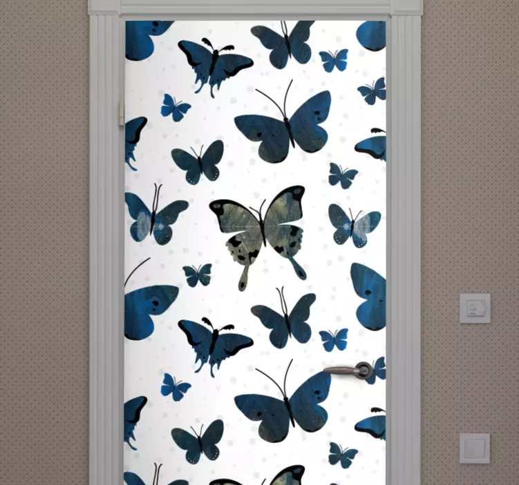 El vinilo para puerta diversos patrones de mariposas presenta un diseño gráfico fresco y vibrante, donde los tonos azules se entrelazan con hermosas mariposas, creando un patrón que evoca la belleza de la naturaleza. Este estampado se convierte en un elemento decorativo ideal para cualquier hogar, aportando color y alegría a la entrada de tu espacio.