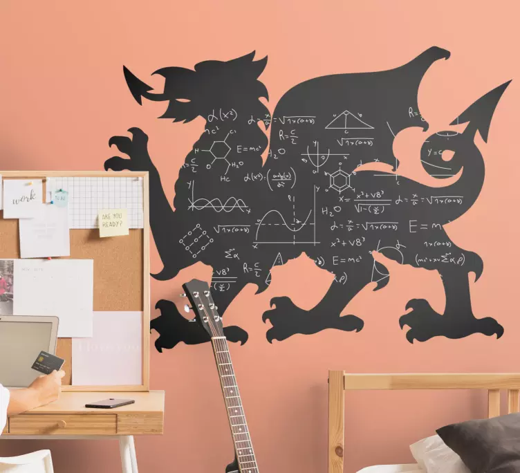 Descubre el vinilo pizarra silueta del dragón galés, un adhesivo que combina un diseño gráfico estilizado y geométrico, representando el emblema galés de una forma única. Este producto es perfecto para quienes desean añadir un toque distintivo a sus espacios, ya que su silueta evoca una conexión con la cultura y las matemáticas, al tiempo que invita a la creatividad y la expresión artística.