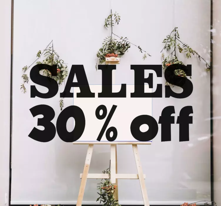 Descubre nuestro vinilo rebajas 30% de descuento, un adhesivo diseñado con un estilo gráfico atractivo que resalta la palabra 'rebajas' y 'ventas'. Este vinilo es personalizable y se adapta a cualquier escaparate o espacio promocional, haciendo que tus descuentos sean irresistibles. Con un acabado satinado, evita los reflejos y garantiza una excelente visibilidad de tus ofertas. ¡Aprovecha esta oportunidad para destacar tus promociones!